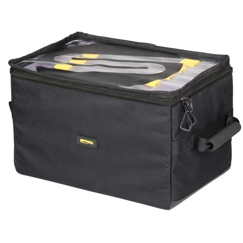 Tacklebox-tas met 3 platte tackleboxen en 1 hoge voor groter kunstaas en accessoires. Voorzien van handgrepen aan de zijkant voor handmatig transport. Compact en makkelijk op te bergen in een kast of boot. Dankzij de transparante, afritsbare deksel kun je eenvoudig de inhoud van de boxen zien en houdt het materiaal droog. De bodem is extra duurzaam en waterdicht.