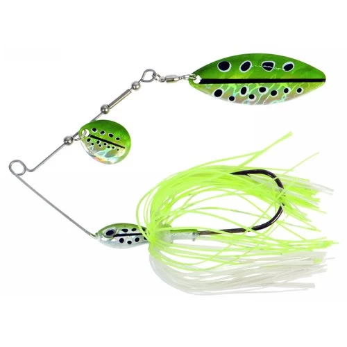 Verleid je volgende grote vangst uit de begroeiing met de Spintexx Spinnerbait series. Het ultieme wapen voor baars, snoekbaars en snoek. De bladen geven een onweerstaanbare reflectie onder water, terwijl de zachte skirt een gewonde aasvis nabootst. De dubbele bladen zorgen voor zeer veel trilling in het water en draaien zelfs bij zeer lage snelheid perfect om de as. Dit kunstaas is ideaal voor de polder en is makkelijk vlak onder het wateroppervlak te bevissen.