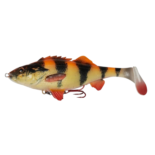 Based on a 3D Scan of a real perch with perfect details and Photo Chrome skin print and added DNA scent! The perch is in periods the main prey for Big pike and these super realistic lures will be deadly! The paddle tail make the lure rock seductively and the rattle in the tail sends out provoking clicks! The 2 smaller sizes is “ready rigged”, with the Belly treble hook mounted on a swivel, so the pike has hard time to throw the hook. The big size, is our Brilliant Linethru design, rigged with the Line thru modifier and changeable rig – the lure will slide up the trace away from the shredding teeth and the Pike cannot use the weight of the big lure to throw the hook.