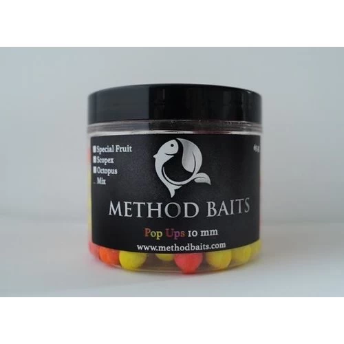 Deze mix bestaat uit een combi van de: Special Fruit, Octopus & Scopex. De kleine 10 mm Fluo Pop-ups zijn uitermate geschikt om in te zetten bij het method feeder vissen, door de kleur en geur springen deze pop ups boven alles uit. Het contrast ten opzichte van de bodem is groot maar ook met bijvoorbeeld pellets of grondvoer. Stel u gebruikt op uw method korf 2 mm Trouvit pellets (bruin) en een oranje fluo pop-up, dan creëert u een groot contrast wat de nieuwsgierigheid van een vis kan triggeren. Ook bij de Method Baits fluo pop-ups is er gebruik gemaakt van flavours op alcohol basis.