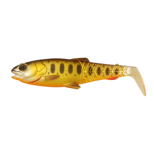 Crafted and designed by legendary designer Mads Grosell. The lure profile is inspired by a baby trout smolt, with the classic Cannibal open mouth, a realistic big soft eye and a new unique tail bridge design, that enables the lure to swim amazingly life-like even at very slow speed. The lure swims equally well on retrieve and as on the drop and the tooling making and handcrafted details and painting set new standards for soft lure making! This paddle tail loose body lure will catch just about any predator fish out there!
