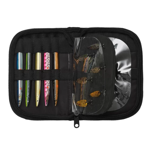 Pocket Zipper wallet made from Soft durable 600Denier fabric with inner lining elastic slots, and a foam wall, with PVC dividers. Perfect for a mix of line thru lures and rigged lures with treble hooks or single hooks. Holds 12 lures plus plenty space for hooks in the foam wall. Oversized nylon head zippers.